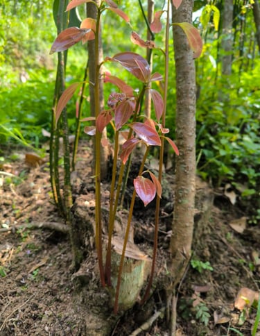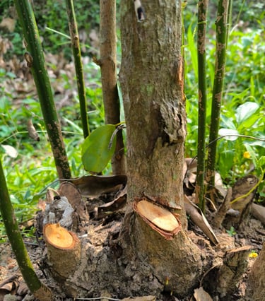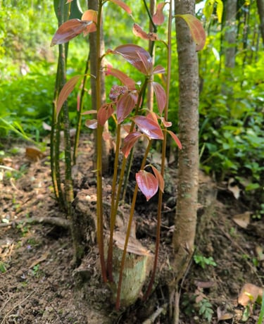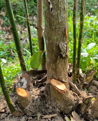 Several Ceylon Cinnamon Trees grow together like a bush. The artisans harvest a cinnamon tree at a 45 degree angle, then they Process Cinnamon Barks for human consumption and the cinnamon wood comes out as a by product during this process. From where the cinnamon tree is harvested, 4 ~ 5 new tender trees will grow within a 6 month crop cycle , which is fascinating !
